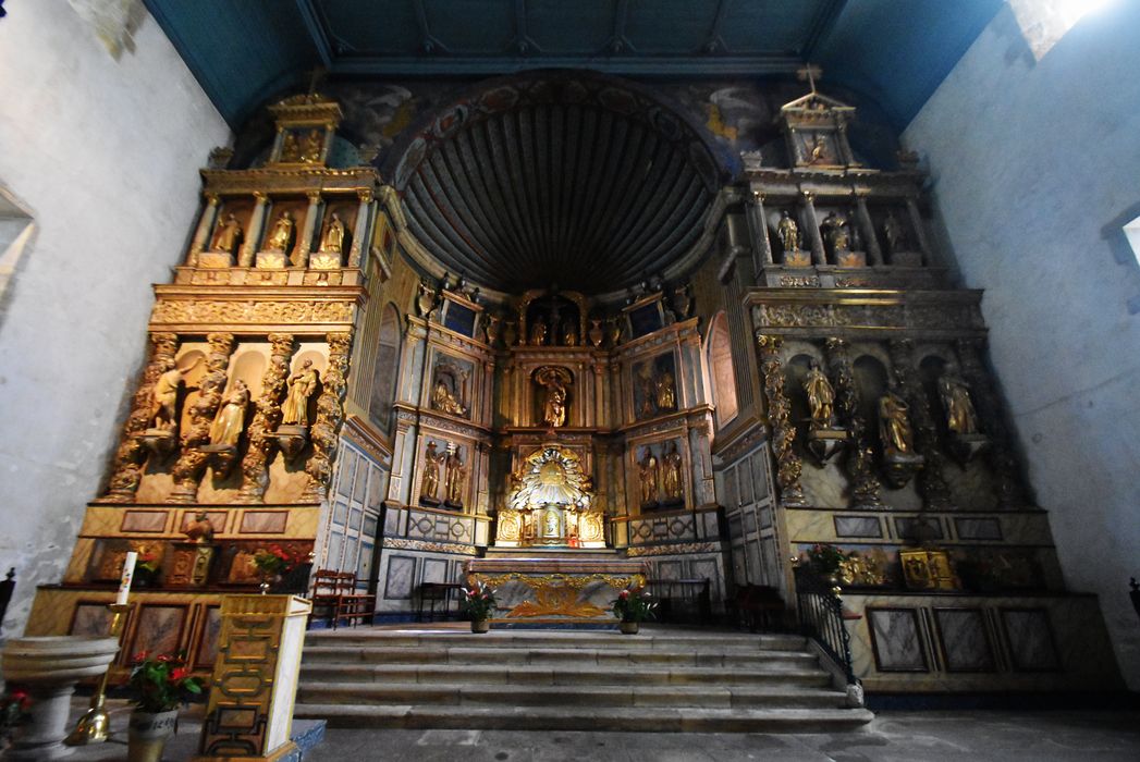 Les statues du retable de gauche représentent : saint Dominique de Guzman, la Vierge de l'Assomption (?) et une autre sainte au registre supérieur ; saint Jean-Marie Vianney, la Vierge à l'Enfant et saint François d'Assise montrant ses stigmates (?), tandis que le panneau sommital porte une représentation de sainte Madeleine pénitente. Les statues du retable de gauche sont également identifiables comme représentant, en haut et de gauche à droite : saint François d'Assise (?), saint Jacques le Majeur et saint Roch ; au registre inférieur : saint Isidore le laboureur (?), saint Joseph (?) et saint Jean-Baptiste, tandis que dans le panneau sommital se trouve saint Michel terrassant le démon. En outre, des panneaux en bas-relief situés sous les colonnes du registre inférieur portent des scènes de la Passion.