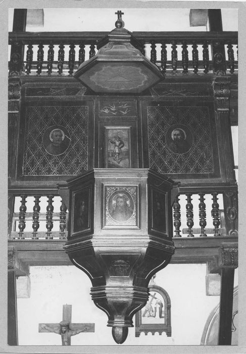Chaire à prêcher adossée et suspendue avec cuve sur culot, panneau d'applique dorsal et abat-voix, en bois sculpté, doré et peint. Les panneaux de la cuve sont peints (celui du milieu représentant le Christ avec une auréole à croix grecque), ainsi que le panneau ornant le dorsal.