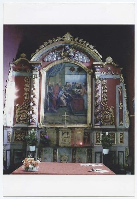 retable, tableau : Présentation de Jésus au Temple, deux statues : Anges céroféraires et huit chandeliers