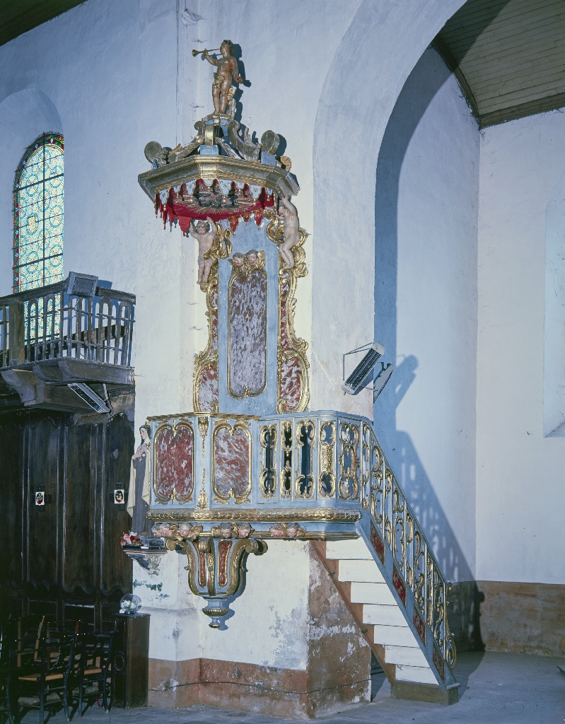 L'abat-voix, surmonté d'un angelot sonnant la trompette, est soutenu par deux angelots cariathides. Le dossier est formé d'une dalle de marbre dans une boiserie. Chaque pan de la cuve est formé d'une dalle de marbre dans une boiserie. La cuve est séparée de l'escalier par un petit palier à balustrade.