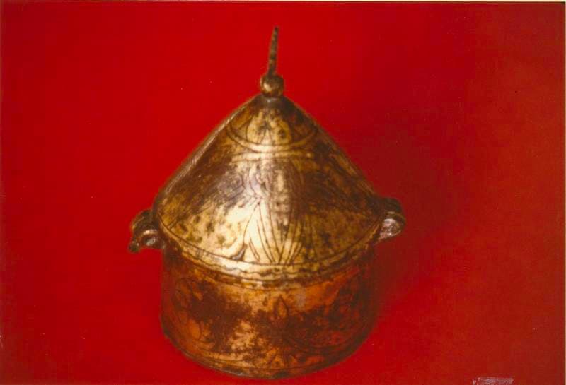 Intérieur hémisphérique. Fond fixé par points de rivetage. Couvercle décoré de deux anges à mi-corps et boîte décorée de marguerites et de fleurs de lys.