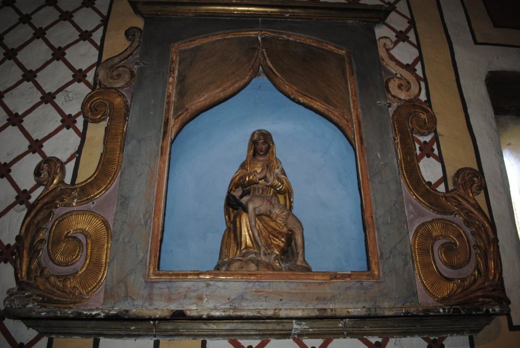 Vierge de Pitié avec son encadrement. Piéta située dans une niche de maçonnerie, avec encadrement de volutes soulignées et couronnées de moulures, le cadre portant un arc tombé surmontant un arc en accolade.