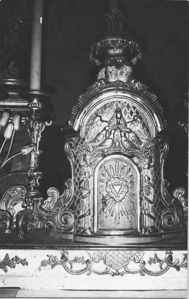 Tabernacle du maître-autel, sa croix et six chandeliers. La façade du tabernacle est bombée. Le fronton est semi-circulaire. Fond décoré d'un treillis losangé. Thèmes : le triangle trinitaire (ici inversé) et le pélican. La croix est attachée au sommet du tabernacle. Les six chandeliers sont à base tripode décorée d'une étoile, fût allongé se terminant en console surmontée d'un noeud à godrons.