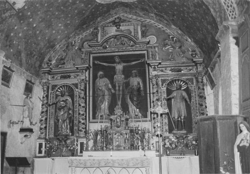 retable, tabernacle, bas-relief, 2 statues du maître-autel : Vierge et saint Jean (la), saint Barthélémy, saint Exupère