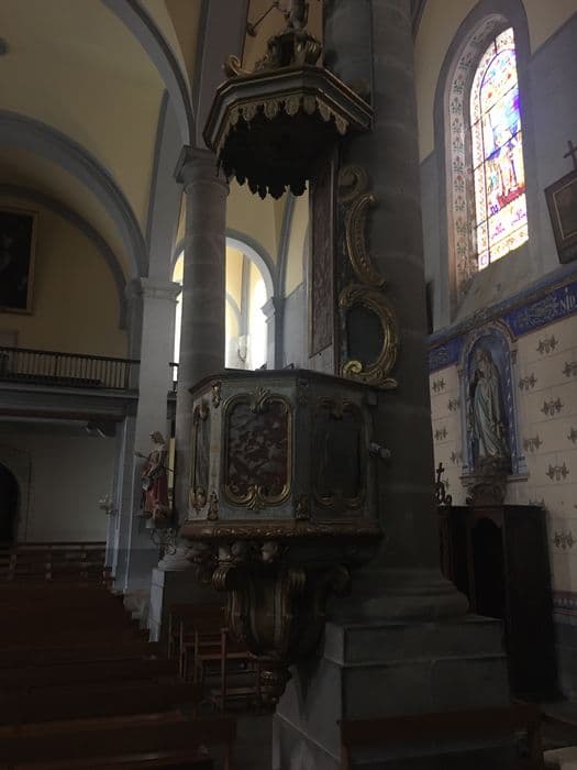 Chaire avec ange sonnant la trompette au sommet du pavillon.