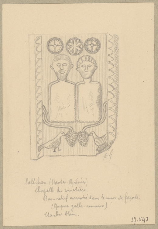 Au centre, deux figures, dans le haut, décor formé de trois marguerites, dans le bas, deux oiseaux picorent des grappes de raisin.