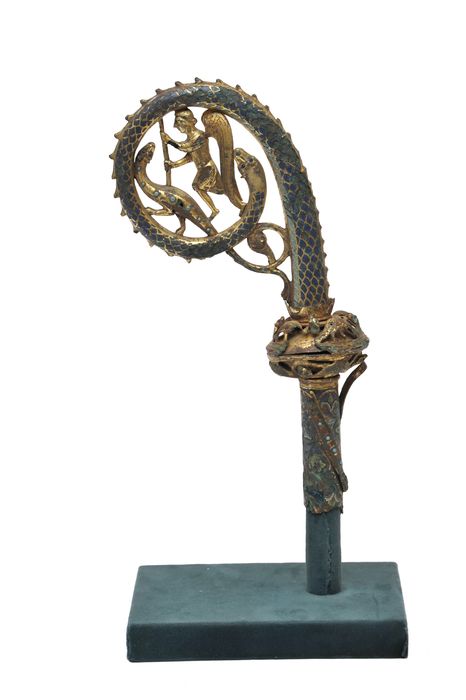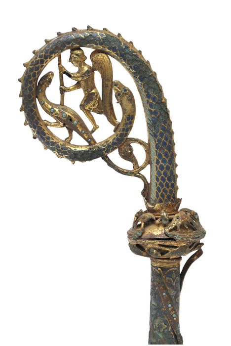 Autour de la douille s'enroulent trois serpents rapportés sur un fond de rinceaux. Le noeud est également orné de serpents entrelacés. L'enroulement de la crosse s'achève sur une tête de serpent. Celui-ci mord les ailes de saint Michel qui combat le dragon au centre de la volute.