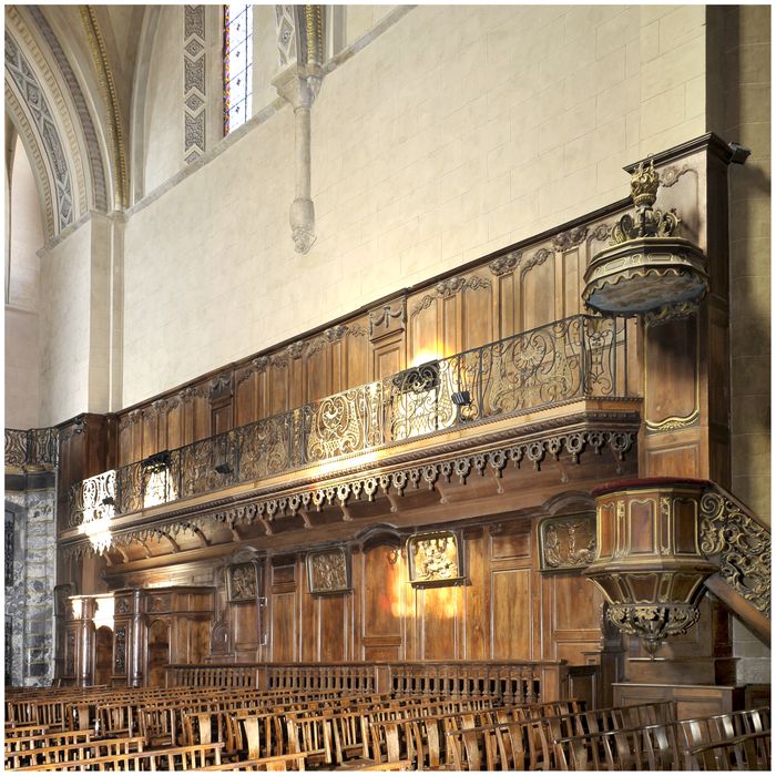 Boiseries de la nef, avec les bancs d'oeuvre, la chaire et les confessionnaux, bois sculpté avec appui de la galerie supérieure en fer forgé.