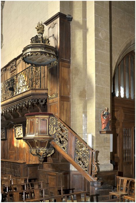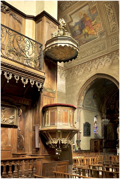 Chaire à prêcher à cuve hexagonale suspendue, élévation galbée à laquelle mène un escalier droit à rampe ajourée. Abat-voix hexagonal orné d'une peinture sur toile marouflée. Les moulures et les parties sculptées sont dorées à le feuille.