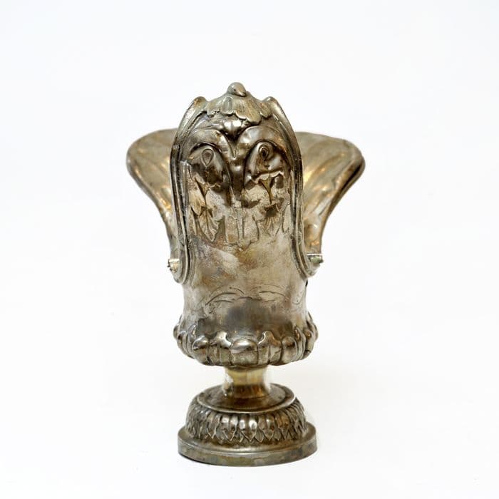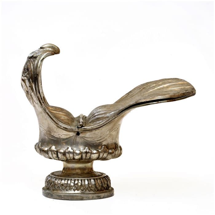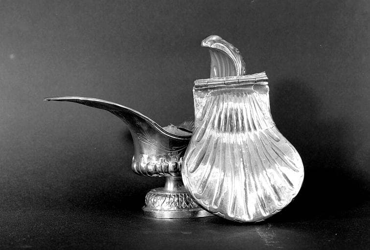 argent : ciselé, ciselé au mat. La panse adopte une forme dissymétrique. Une partie du couvercle pivote autour d'une charnière, l'autre étant fixe. Couvercle légèrement renflé. Pied ovale.