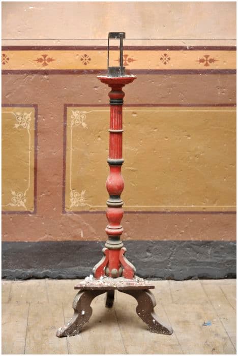 Pied triangulaire. Bois peint en rouge et noir. Partie supérieure en fer peint en noir.