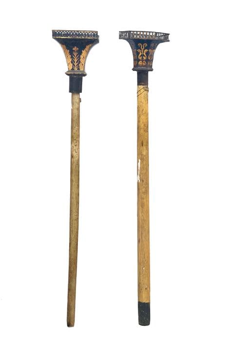 Porte-cierge de procession de forme octogonale en tôle peinte en bleu avec motifs or, à bord supérieur doré et ajouré. La hampe est en bois tourné peint.