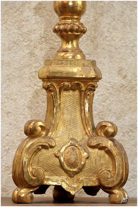 Pied triangulaire reposant sur des enroulements. Noeud en balustre. Fût triangulaire amorti dans la partie supérieure par des enroulements.