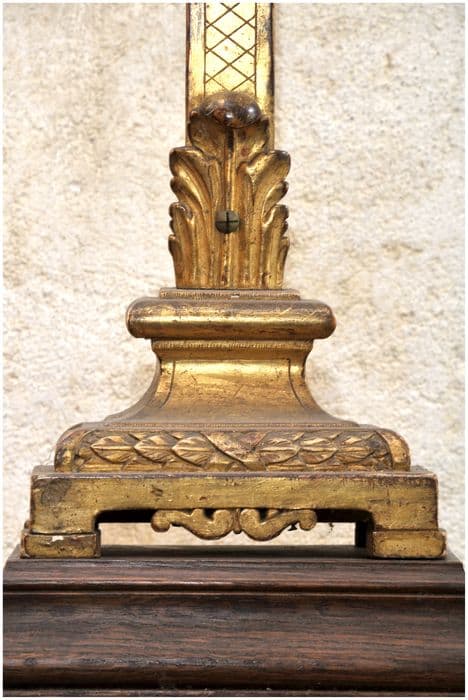 Croix dorée à la feuille ; pied rectangulaire ; fleurons ajourés aux extrémités de la croix. Christ peint.