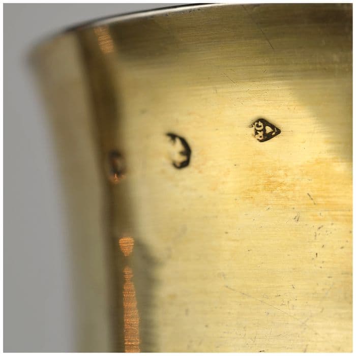 Calice en argent doré, noeud ovoïde, coupe lisse, pied circulaire légèrement bombé à décor ciselé.