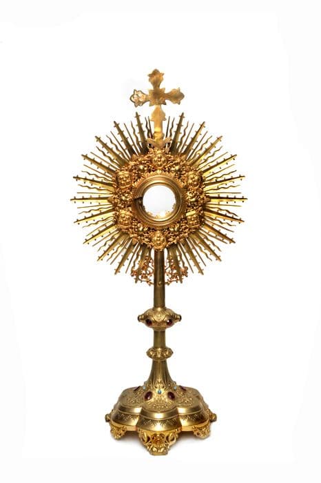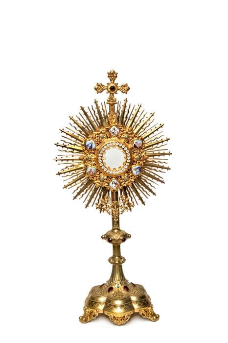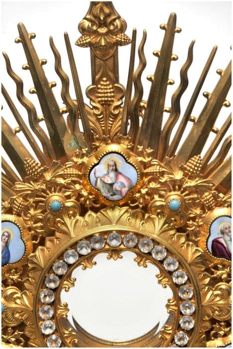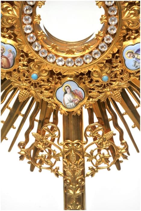 Ostensoir à pied polylobé à décor de médaillons quadrilobés en porcelaine peinte, de cabochons de verre rouge et de cabochons d'émail turquoise. Noeud aplati à boutons.