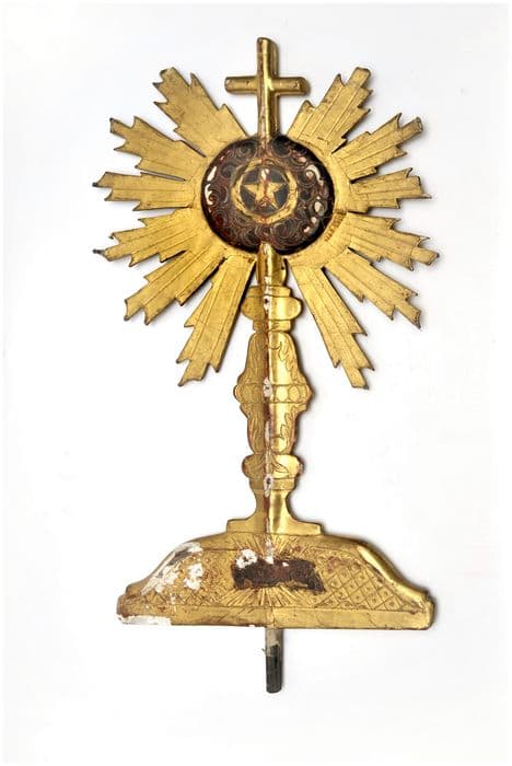 Elément plat en bois doré à la feuille et apprêt gravé en forme d'ostensoir qui était fixé sur un support comme en témoigne le tenon à la base de l'objet.
