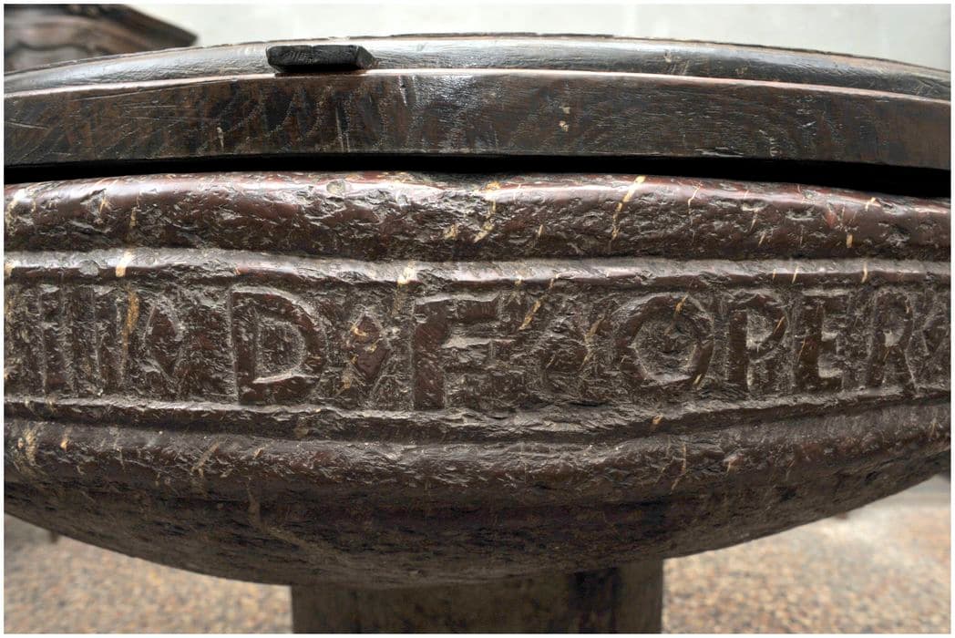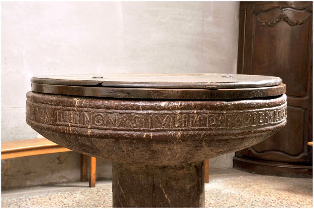 Fonds baptismaux en marbre rouge, de forme circulaire ornée de deux moulures. Ils sont surmontés d'un couvercle en noyer ouvrant par moitié.