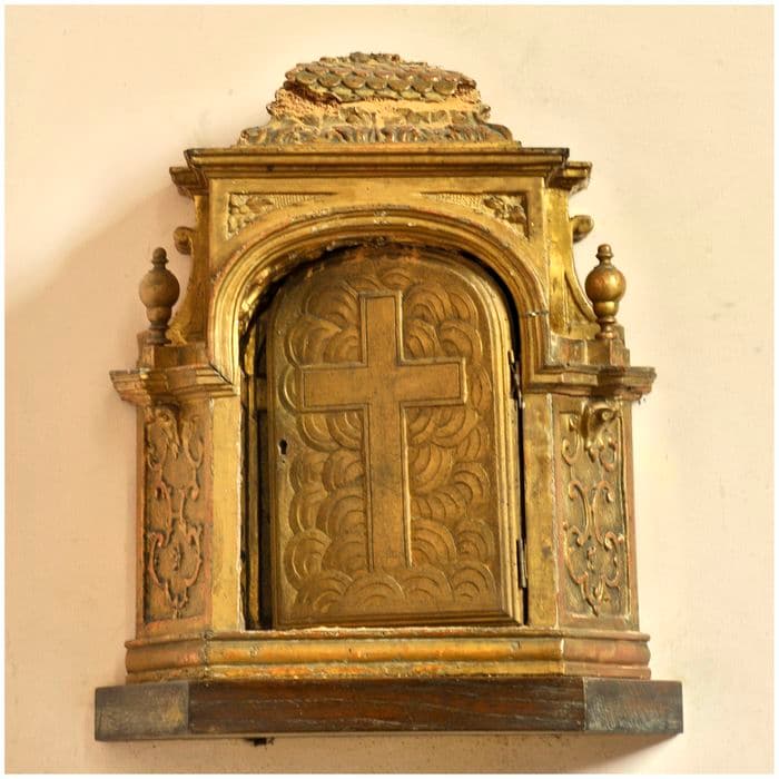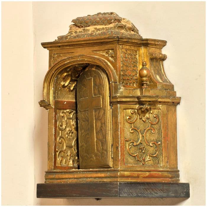 Tabernacle du Jeudi saint en bois doré à la feuille en forme de petit édicule. Les côtés sont légèrement évasés vers l'arrière. Il est muni d'une porte cintrée sur le devant. Décor en très léger relief aussi bien à l'extérieur qu'à l'intérieur.