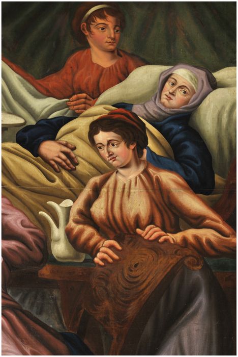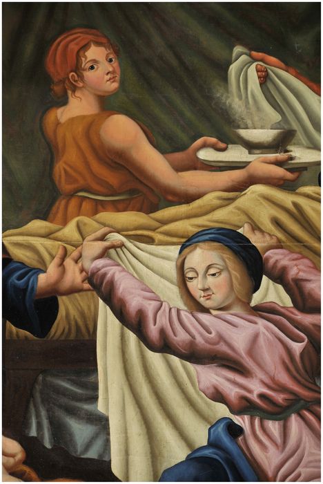 Sainte Anne est allongée sur un lit alors que des femmes préparent le bain de la Vierge. Le cadre est et orné de guirlandes de fleurs.