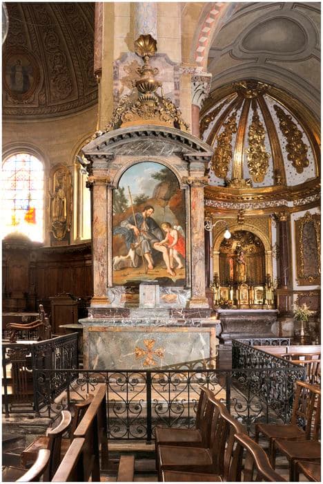 Autel, deux degrés d'autel, gradin d'autel, tabernacle et retable en marbre. Autel de forme droite ; petit tabernacle rectangulaire ; retable flanqué de deux pilastres plats surmontés d'un fronton cintré.