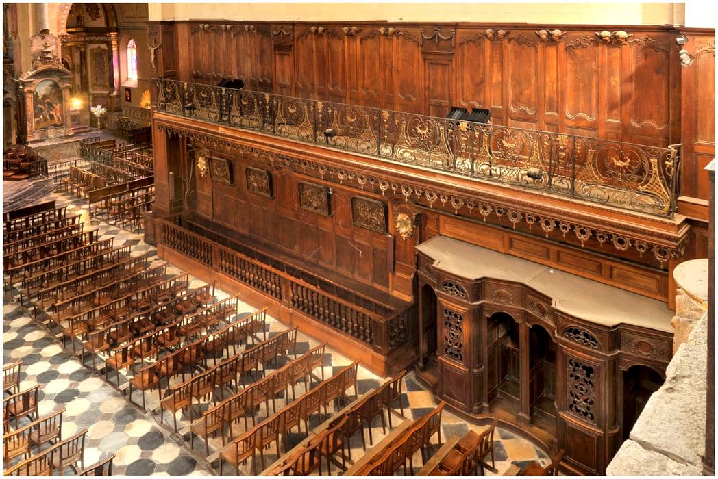 Banc d'oeuvre à une rangée surmontée de lambris terminés d'une galerie. Aux extrémités occidentales, deux confessionnaux prolongent les bancs d'oeuvre.