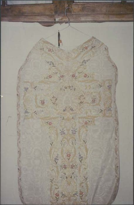 Chasuble en satin moiré brodé d'argent et de soie de couleur.