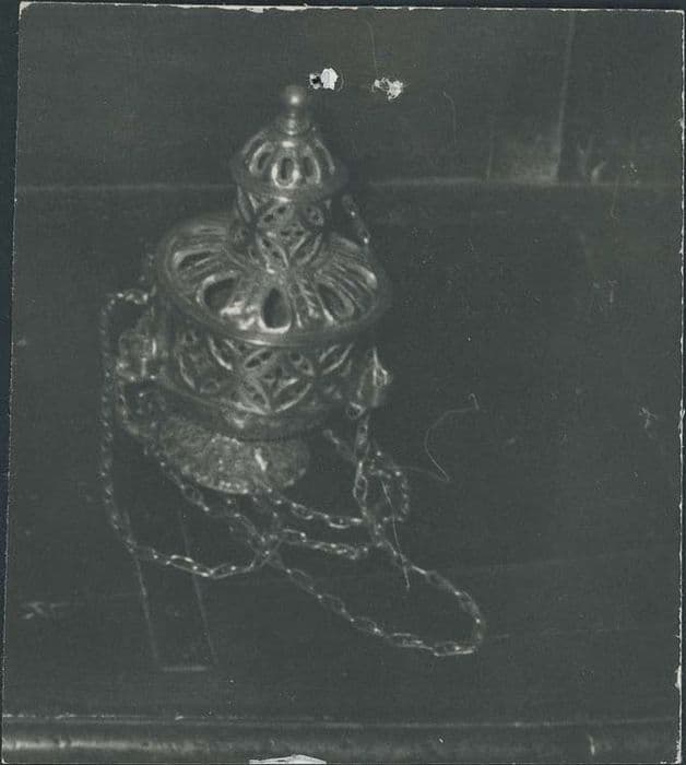 Pied à décor de feuillage. Panse cylindrique à décor de rosaces à quadrilobes ajourés. Chaînettes avec rondelles d'attache. Couvercle ajouré surmonté d'un dôme à boule.