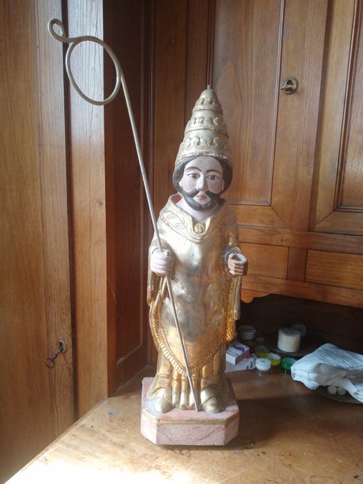 Statuette dite de saint Bertrand : le saint est coiffé d'une tiare conique et donne sa bénédiction. Il doit plutôt s'agir d'un pape, saint Pierre ou saint Grégoire.