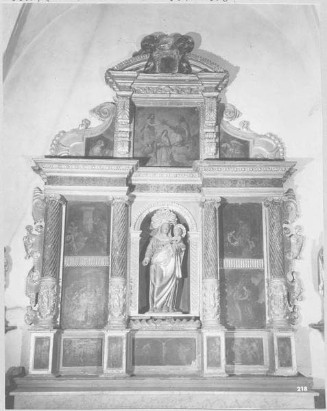 POP | Plateforme ouverte du patrimoineretable du Rosaire, statue : Vierge à l'Enfant, 7 tableaux : le Couronnement de la Vierge, l'Annonciation, la Présentation au Temple, Jésus parmi les docteurs, la Nativité, la Visitation, la Crucifixion