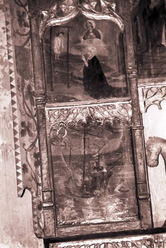 Antependium : peinture à la détrempe sur toile marouflée et enduite de plâtre (?). retable et antependium en bois sculpté et peint. statue en bois peint et doré. Le retable est divisé verticalement par deux contreforts surmontés de pinacles en trois registres. Trois panneaux peints décorent chacun des volets latéraux. Le compartiment central, plus haut que ces derniers et dont la moitié inférieure est occupée par la niche abritant la statue du saint, ne comporte qu'un panneau peint, au sommet.