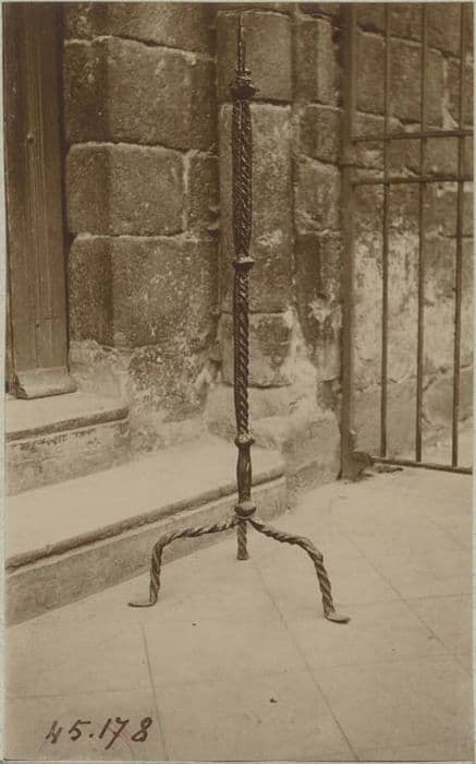 Chandelier à trois pieds, tige avec un noeud au milieu de la hauteur. Tige centrale en torsade accompagnée de quatre tiges plus petites en torsade également. La coupe horizontale de la tige est cruciforme. Il existe deux chandeliers, dont un seul est classé.