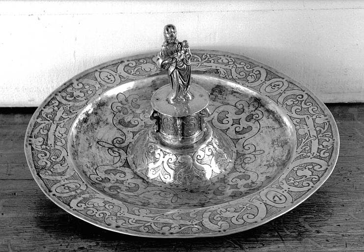 Le plat porte un décor de volutes gravées. La Vierge couronnée tenant l'enfant sur son bras gauche se dresse sur un socle circulaire au décor de volutes entre six contreforts.