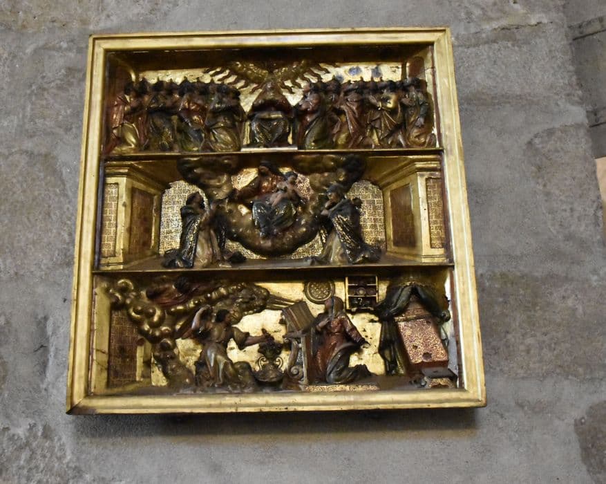 bas-relief du retable du Rosaire : Pentecôte, la Vierge du rosaire avec saint Dominique et sainte Catherine, l'Annonciation