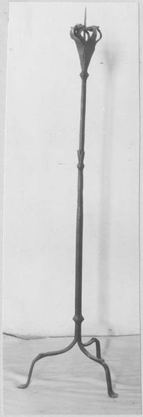 Chandelier constitué d'une tige assez grêle plantée sur trois pieds arqués. La tige est dessinée à la partie supérieure par une fleur de lys en tôle découpée qui s'éparnouit au-dessus d'un anneau, quatre pistifs s'échappant du calice. Une autre fleur de lys s'épanouissait au-dessus d'un anneau intermédiaire qui a disparu.
