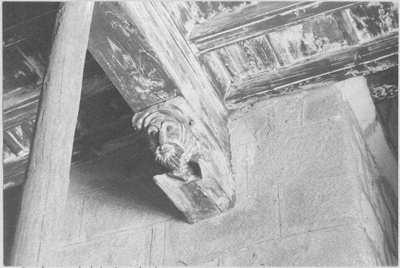 Le plancher est soutenu par treize solives, aux extrémités façonnées comme une sorte de proue, suivant un épannelage traditionnel, très fréquent en Roussillon. Les solives reposent elles-mêmes sur une poutre maîtresse, encastrée dans les piliers occidentaux de la nef et renforcée par deux corbeaux, sculptés l'un d'une tête d'homme, l'autre d'une tête de femme, où l'on voit des traces de peinture (volutes et fleurons). La tradition locale veut qu'elles représentent les 'donateurs', grâce à qui l'oeuvre aurait été exécutée. L'ensemble était peint et l'on discerne encore très bien le décor de dents de loup des couvrejoints lamellaires, caractéristiques des plafonds roussillonnais des 14e et 15e siècles. La balustrade a-t-elle été refaite postérieurement ? C'est possible, mais les balustres n'en présentent pas moins un profil archaïque. Au-dessus de celle-ci, une poutrelle, soutenue par deux poteaux latéraux, porte trois pièces de bois verticales, moulurées comme des modillons. Elles sont percées latéralement et paraissent avoir supporté deux carillons ou roues à clochettes, par l'intermédiaire d'une longue tige ou manivelle de fer forgé, retrouvée derrière le retable.