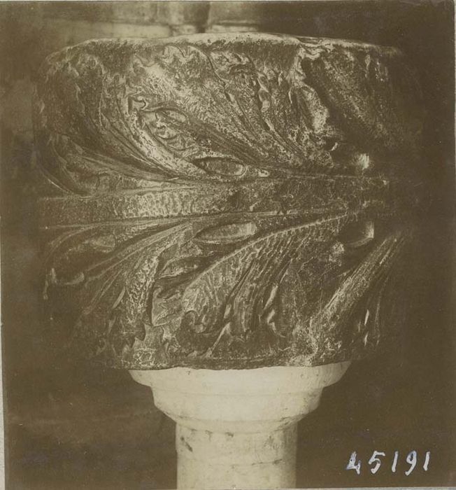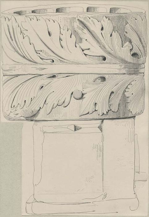 Bénitier pédiculé. Partie supérieure à seize facettes verticales posées sur une tore horizontale au-dessous duquel la cuve prend une forme de calotte hémisphérique posée sur un pilier dont le sommet est épanoui en tronc de cône pour former une sorte de chapiteau. Base très simple.
