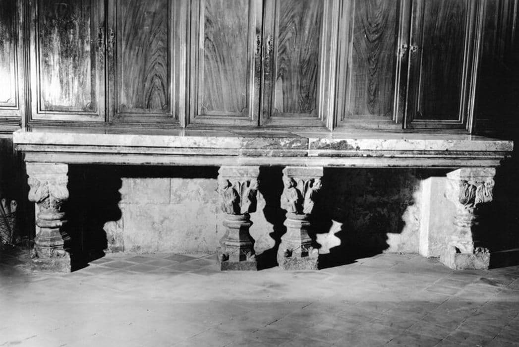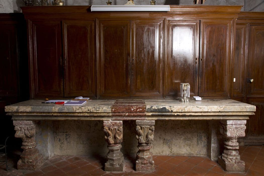 table de la sacristie formée de deux dalles funéraires (?) posées sur seize chapiteaux