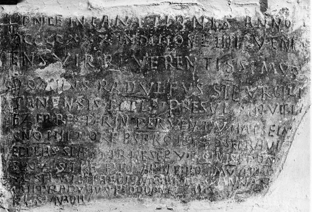 Transcription : + D NICE INCARNATIONIS ANNO DCCCCXXX INDICIONE IIII VENIENS VIR REVERENTISSIMUS DOMINUS RADULFUS S TE ENERRE PER INTERVENTU HAC SE IN GNO HISTORE F SB RO IBIQ SECRAVIL ECCL AS D C RE MARIAE S P VIRGINIS et OM IN S C OR S C I PETRI AP LI ER OM IN AP LOR V L I et MICHAELIS ARC G LT EPI ANNO OBIIT RAVULFUS ODDUNE K L S MADIR. Date : 934.