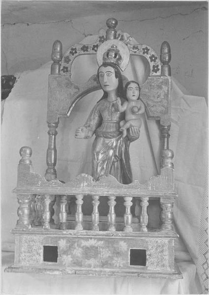 Vierge à l'Enfant, statue, bois doré et peint, dans sa chaire de procession et son armoire, bois peint, début du 17e siècle (Vierge et chaire) et 18e siècle (armoire). Vierge de type populaire, repeinte, mais dont la dorure est intacte et les vêtements d'une ornementation excellente (décor de fleurs, ramages et hachures, obtenu par regrattage de la feuille d'or, faisant apparaître la peinture sous-jacente). Type intéressant de la chaire processionnelle (cadireta) , inspirée des fauteuils locaux à balustres du début du 17e siècle (dorures et peintures anciennes). Cet ensemble est complété par une armoire à décor intérieur peint, d'allure 17e siècle, travail d'art populaire qui, d'après certains échantillons locaux datés, ne doit pas être antérieure au 18e siècle.