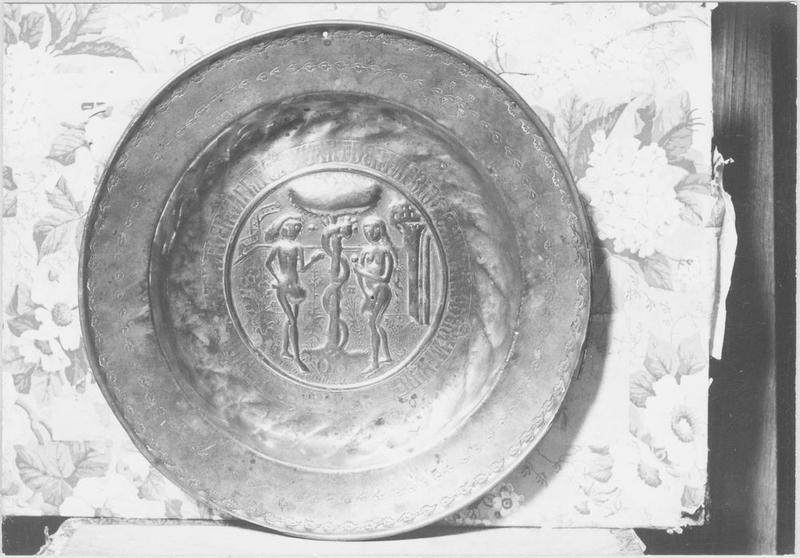 Décor de feuilles estampées sur le marli. Dans le creux, ornement cordé, au repoussé, puis les inscriptions en gothique carrée, fréquentes dans ce genre de plats, autour d'un motif central dans un cadre circulaire, représentant Adam et Eve autour de l'arbre de la Connaissance du Bien et du Mal, autour duquel s'enroule le serpent.