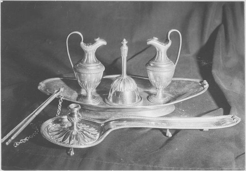 POP | Plateforme ouverte du patrimoinechapelle style Louis XVI : plateau à burettes, burettes, clochette, bougeoir, mouchettes (pince à moucher)