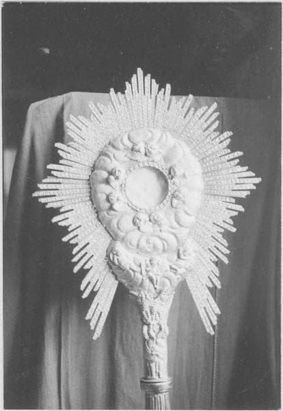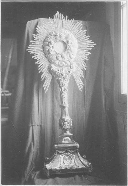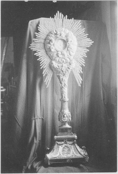 Grand ostensoir. socle en tronc de pyramide. Fût en balustre, partant d'une base rectangulaire. Le cercle que compose le soleil est irradié de rais inégaux, garnis de pierreries blanches.