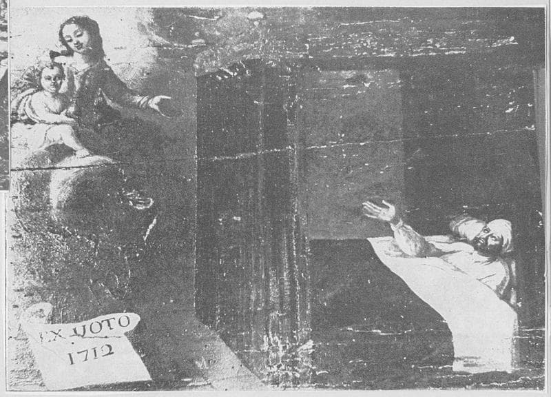 Fonctions combinées. Un malade, couché dans un lit à baldaquin, invoque la Vierge qui apparait.