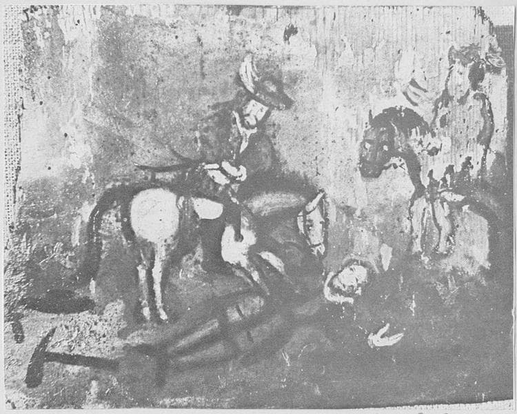 Fonctions combinées. Deux cavaliers sont en selle tandis qu'un homme est piétiné par un cheval.