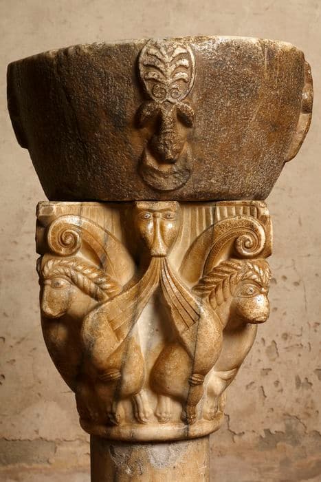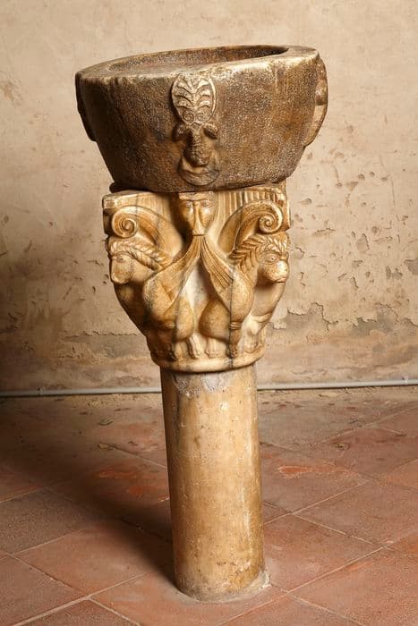 Cuve conique supportée par un chapiteau sur une colonnette tronquée.