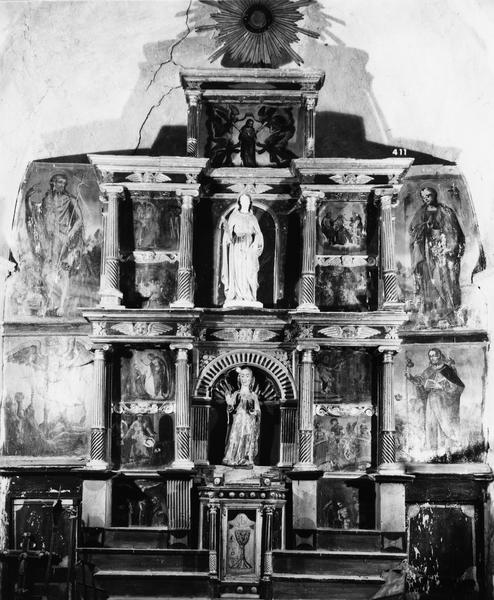 Retable du Rosaire ou de sainte Eugénie, avec panneaux peints, tabernacle, bois sculpté, peint et doré, fin du 16e siècle ; sainte Eugénie, statue, bois polychrome, 15e siècle.