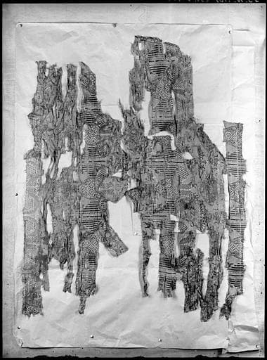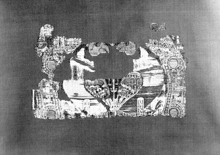 Fragments de tissu provenant d'une ancienne chasuble (qui servait à vêtir la Vierge). Le tissu est de couleur rouge, avec des dessins noirs et jaunes représentant l'aigle bicéphale aux oreilles pointues tenant dans ses serres un quadrupède.