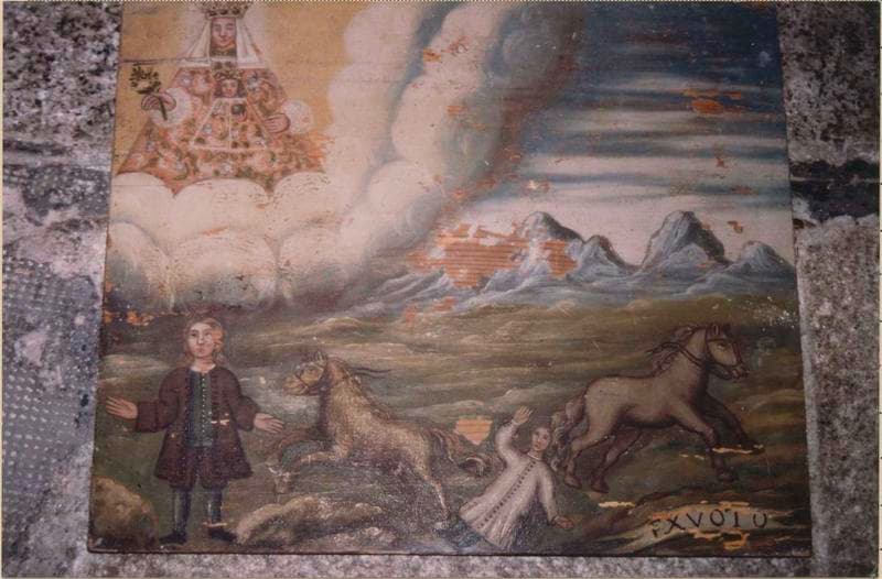 Inventaire n°15. Fonctions combinées. Ex-voto pour un accident de cheval ? deux personnages, deux chevaux, paysage de montagnes dans le fond.