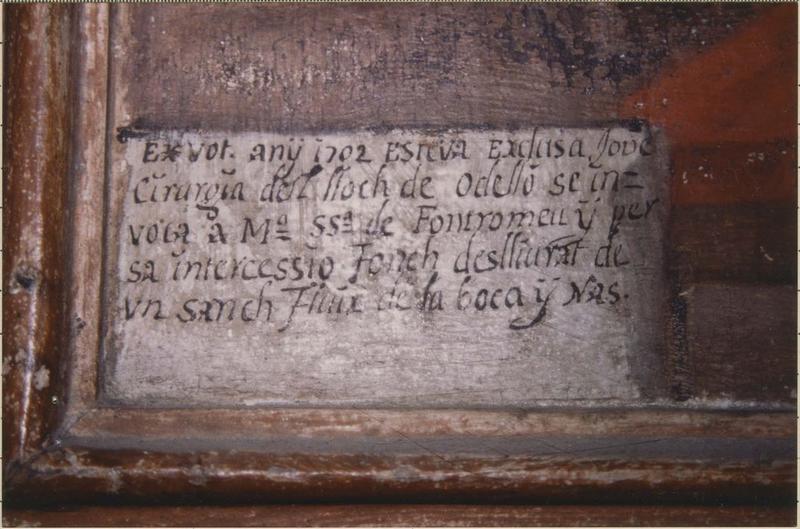 Inscription : Ex vot. ANY 1702 Esteva Exclusa, Jove, cirurgia dl lloch de Odello se invoca a Ma SSa de Fontromeu ÿ per sa intercessio fonch deslliurat de un sanch flûx de la boca ÿ nas, que l'on peut traduire par Ex-voto. Année 1702. Etienne Esclusa, jeune, chirurgien du lieu d'Odello, invoqua N. -D. de Font-Romeu et par son intercession fut délivré d'une abondante et persistante hémorrhagie. Date : 1702.